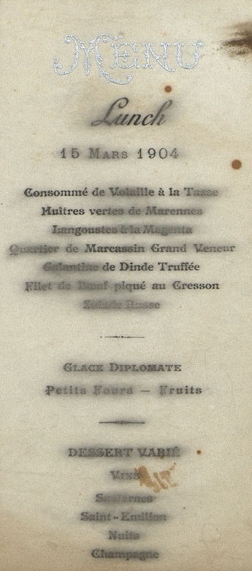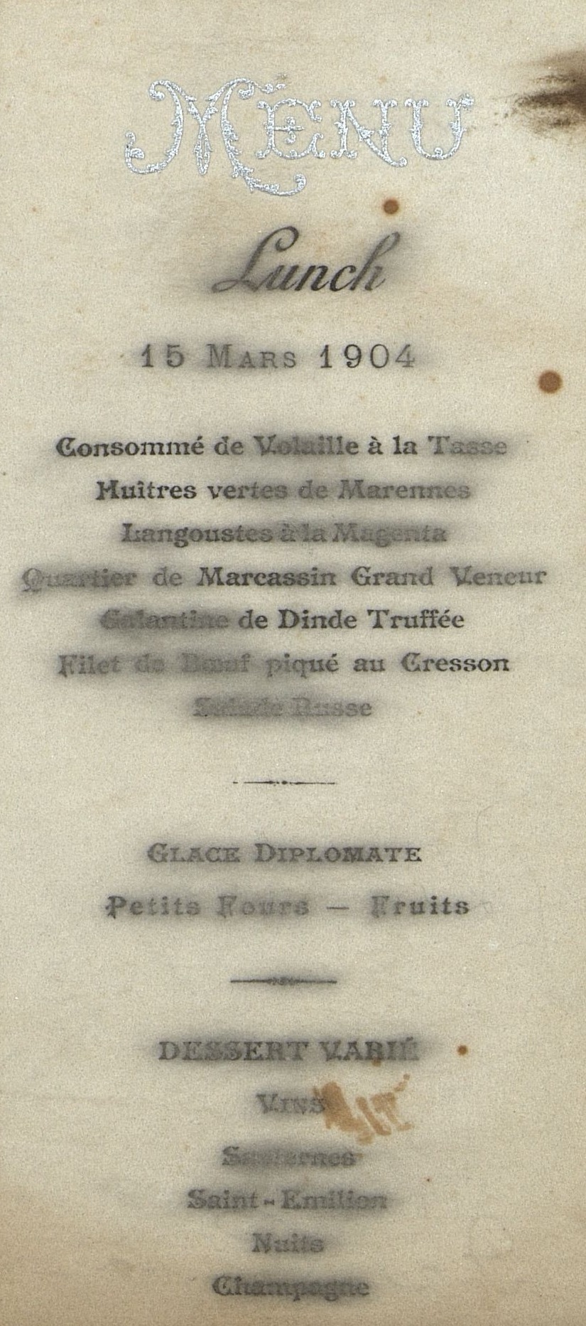 Lunch du 15 mars 1904. Menu très altéré. Titre en capitales aux rinceaux argentés.