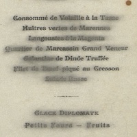 Note manuscrite au verso : Docteur Pellisson. - Plats servis : Consommé de volaille à la Tasse. Huitres vertes de Marennes. Langoustes à la Magenta. Quartier de Marcassin Grand Veneur. Galantine de Dinde Truffée. Filet de Bœuf piqué au Cresson. Salade Russe. Glace Diplomatique. Petits Fours. Fruits. Dessert varié.