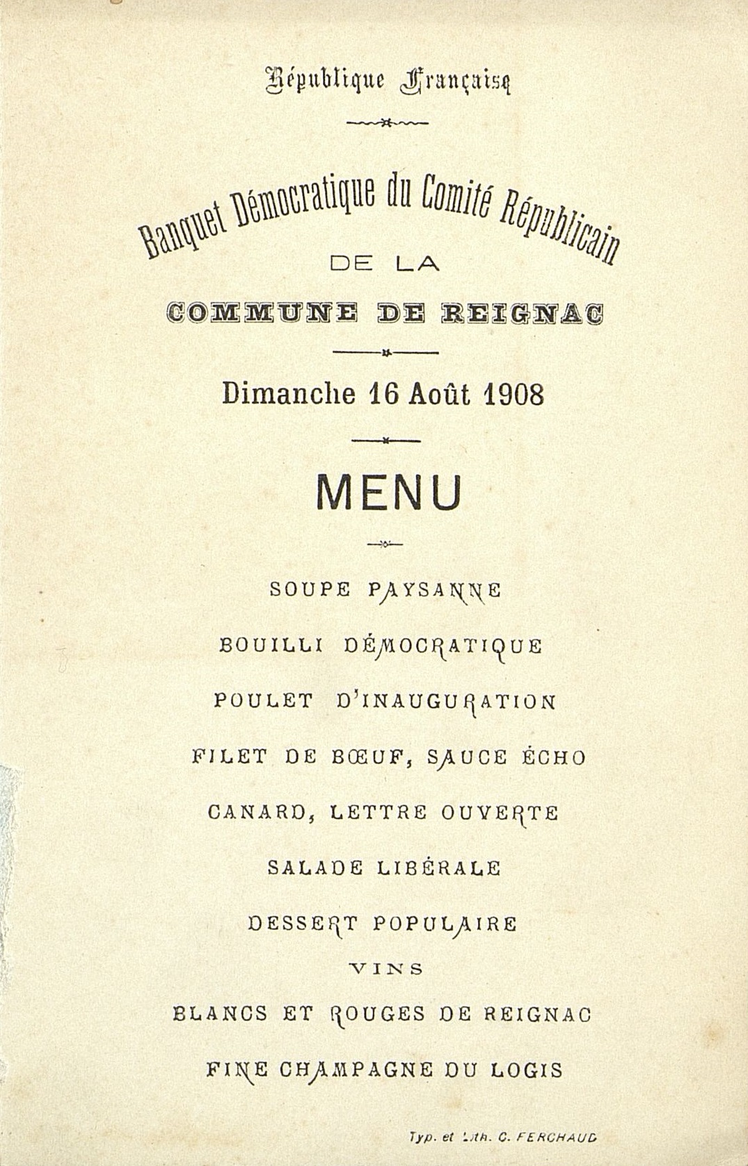 Plats servis : Soupe paysanne. Bouilli Démocratique. Poulet d'inauguration. Filet de Bœuf sauce Écho. Canard lettre ouverte. Salade Libérale. Dessert populaire.