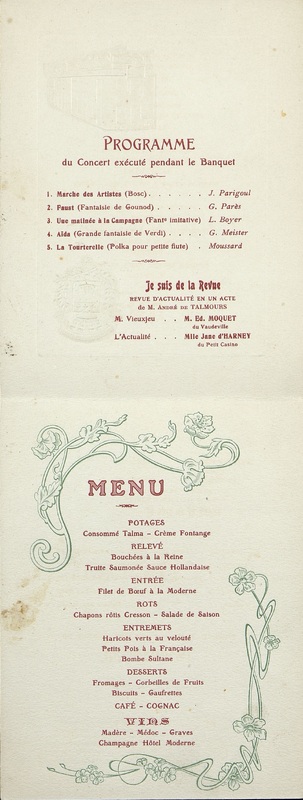Plats servis : Consommé Talma. Crème Fontange. Bouchées à la Reine. Truite saumonée sauce Hollandaise. Filet de Bœuf à la Moderne. Chapons rôtis Cresson. Salade de saison. Haricots verts au velouté. Petits Pois à la Française. Bombe Sultane. Desserts. Fromages. Corbeilles de Fruits. Biscuits. Gaufrettes.