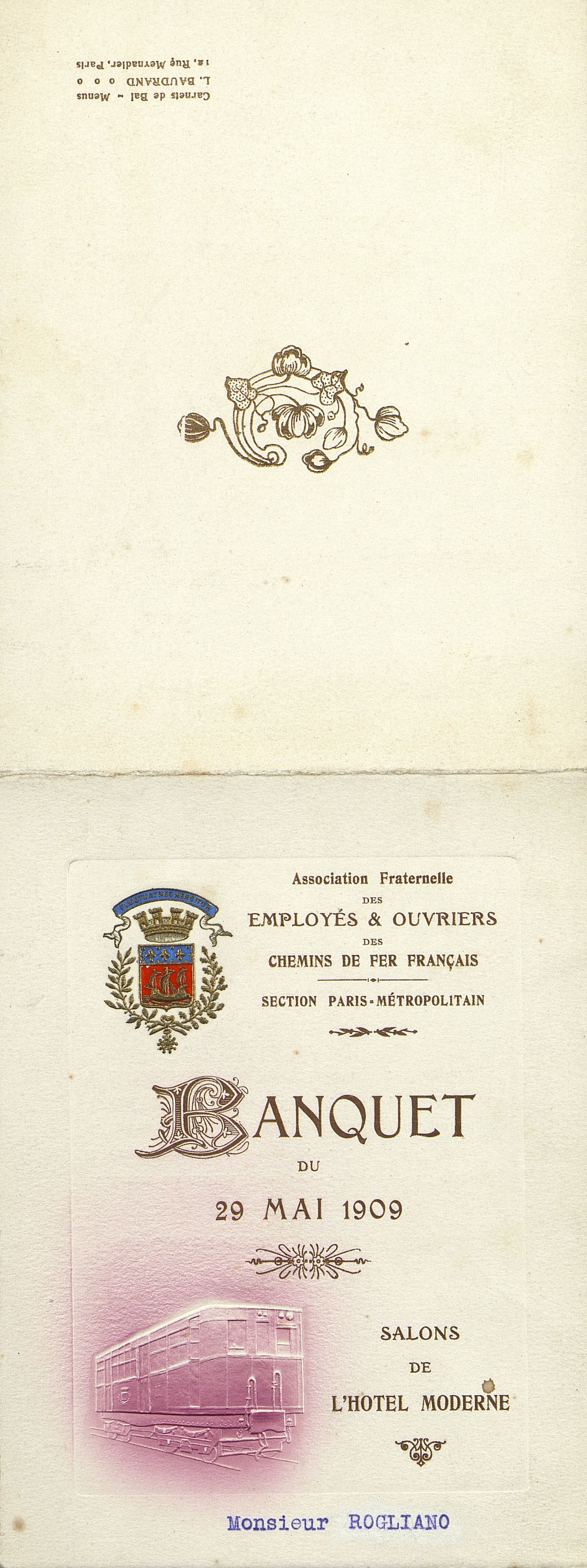 Association fraternelle des Employés et Ouvriers des Chemins de Fer français. Menu-programme pliant.