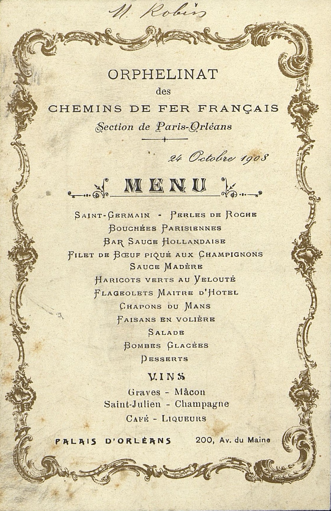 Menu de l'Orphelinat des Chemin de Fer français, décor Louis XV, avec tores et acanthes.