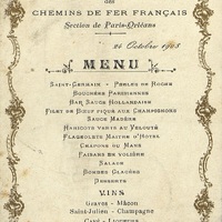 Plats servis : Saint-Germain, Perles de Roche ; Bouchées Parisiennes ; Bar sauce Hollandaise ; Filet de Bœuf piqué aux Champignons sauce Madère ; Haricots verts au Velouté ; Flageolets Maître d'Hôtel ; Chapons du Mans ; Faisans en volière ; Salade ; Bombes Glacées ; Desserts.