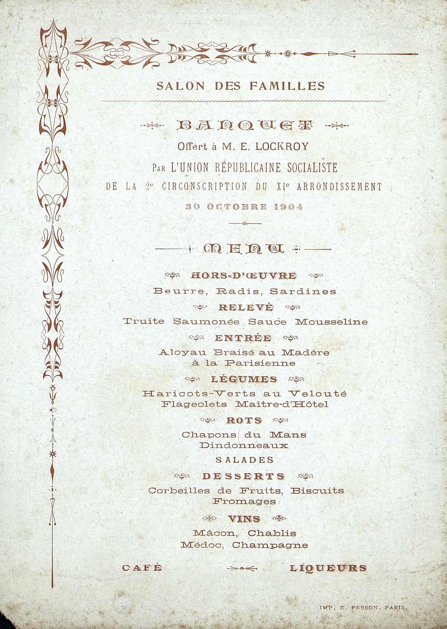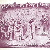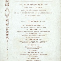 Banquet offert à M. Lockroy [Édouard dit Lockroy fils, de son vrai nom Édouard-Étienne-Auguste Simon (1838-1913)] . Le menu porte au dos une publicité pour le Salon des Familles où se tient ce banquet.
