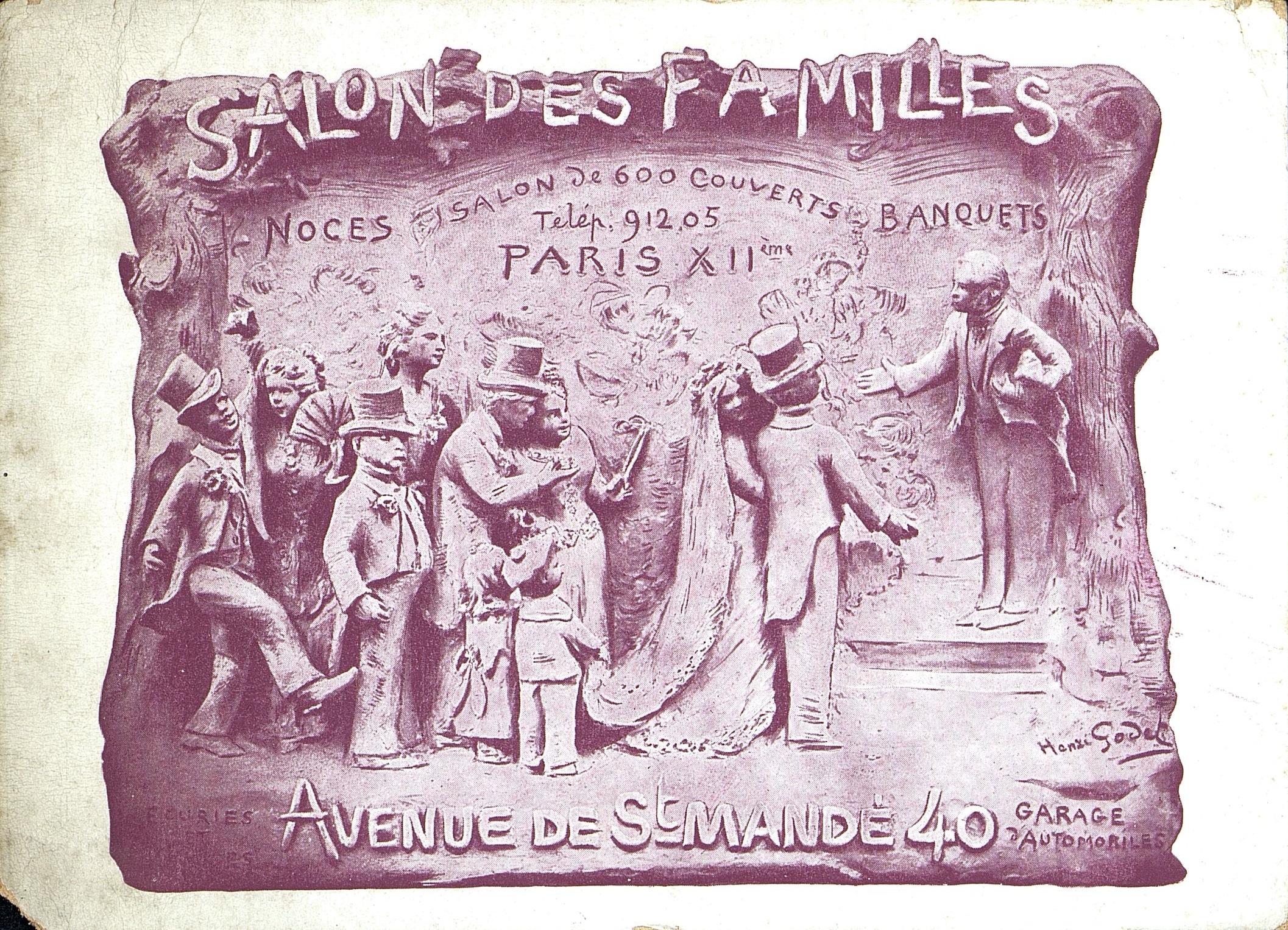 Illustration : Bas-relief en terre cuite d'une scène de mariage de Henri Godet porte publicité pour le 40 Avenue de St-Mandé.