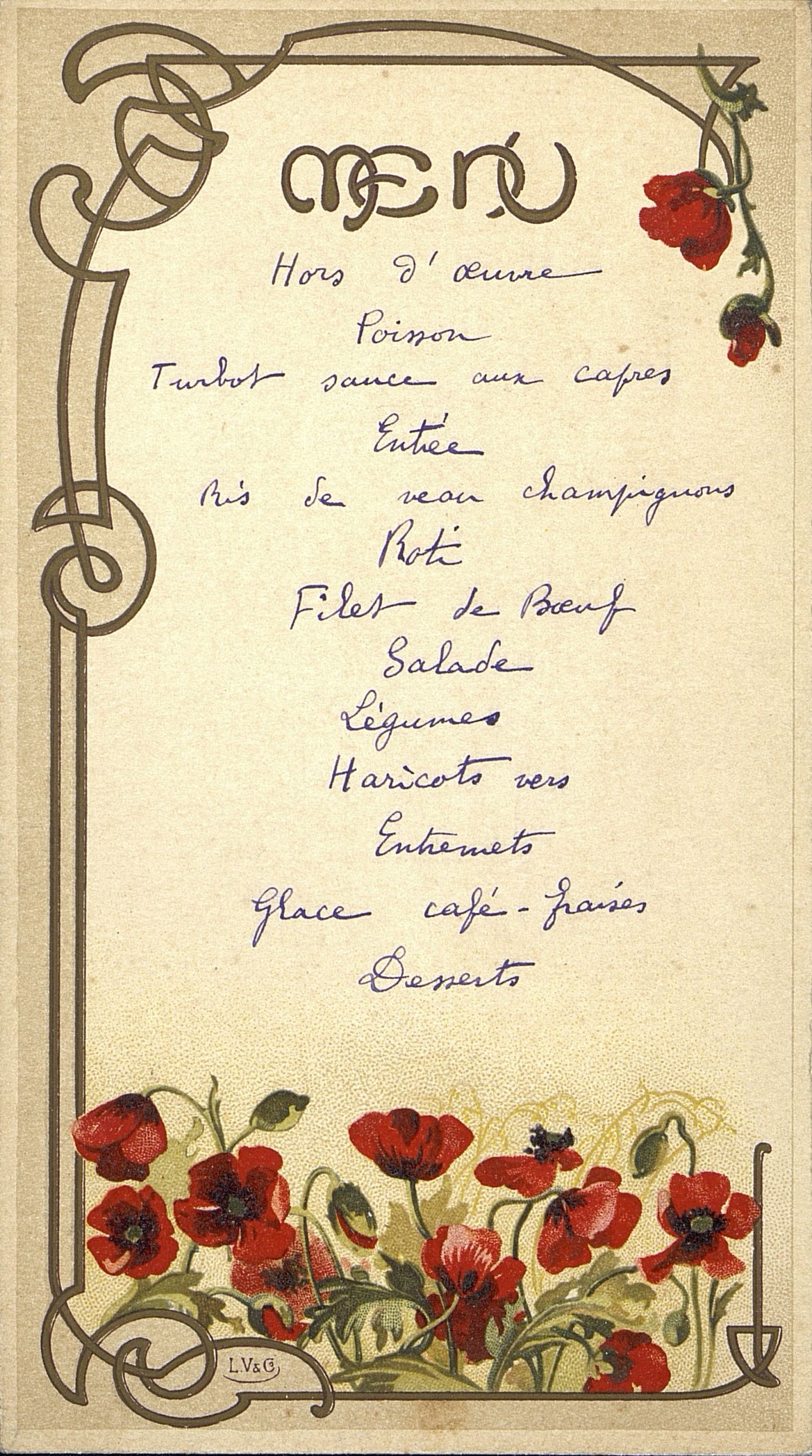 Plats servis : Hors d’œuvre. Poisson. Turbot sauce aux câpres. Entrée. Ris de veau champignons. Rôti. Filet de bœuf. Salade. Légumes. Haricots verts. Entremets. Glace. Café. Fraises. Desserts.