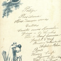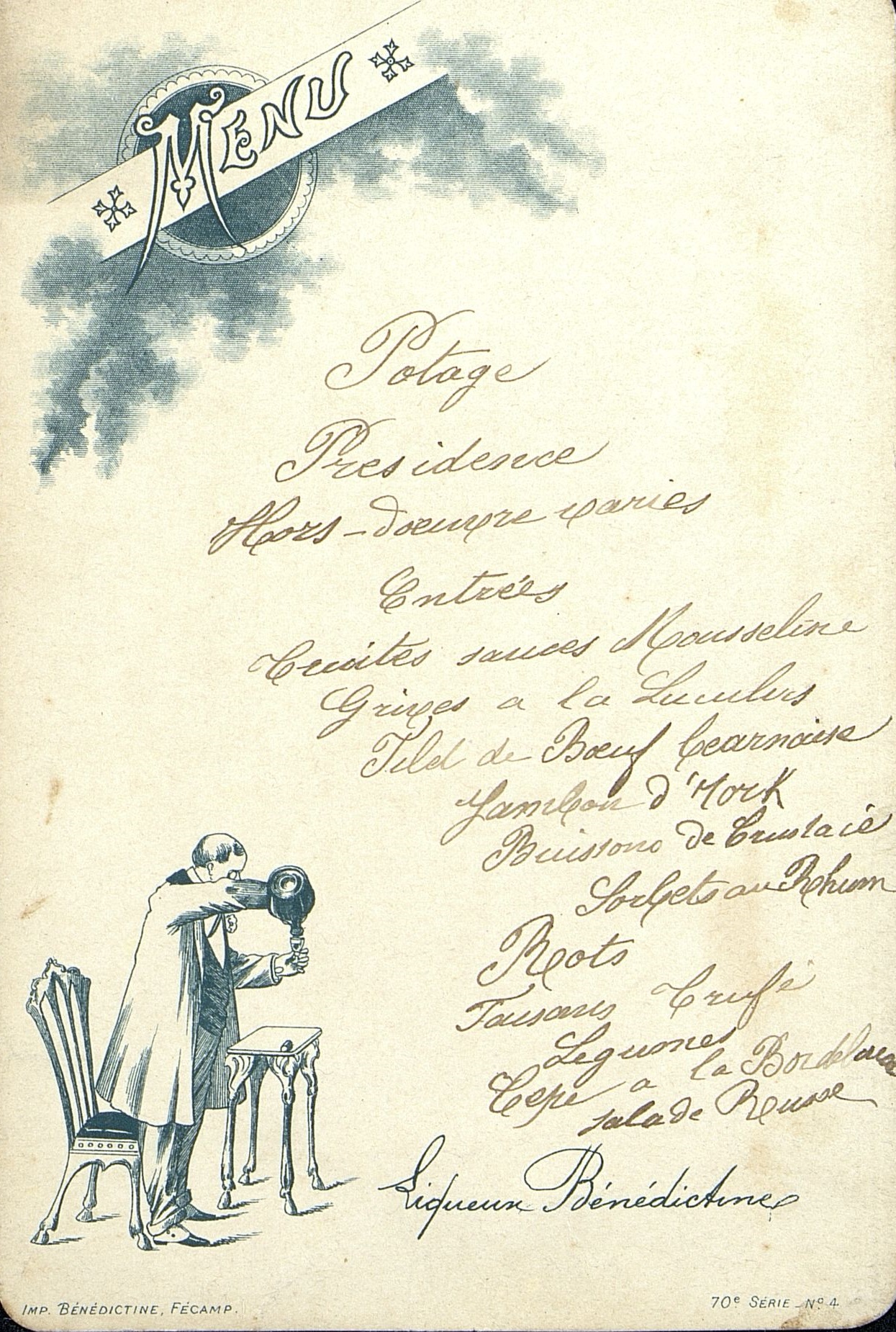 Menu manuscrit illustré et publicitaire pour la Bénédictine. Au dos, Mme Raoul Puybaraud. Chaise et guéridon aux pieds de biche.