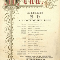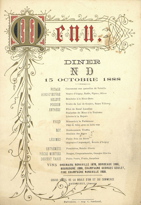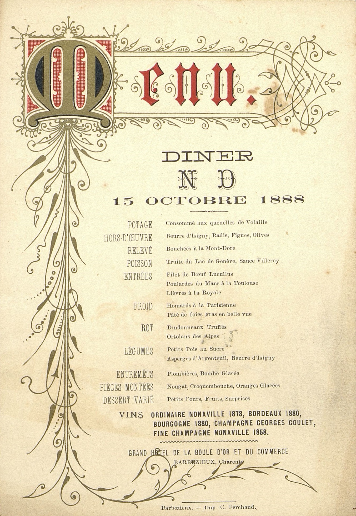 Plats servis : Potages : Consommé aux quenelles de Volaille. Hors-d’œuvre : Beurre d'Isigny. Radis. Figues. Olives. Relevé : Bouchées à la Mont-Dore. Poisson : Truite du Lac de Genève sauce Villeroy. Entrées : Filet de Bœuf Lucullus. Poulardes du Mans de Toulouse. Lièvres à la Royale. Froid : Homards à la Parisienne, Pâté de foies gras en belle-vue ; Rot : Dindonneaux truffés, Ortolans des Alpes ; Légumes : Petits Pois au Sucre, Asperges d'Argenteuil beurre d'Isigny. Entremets : Plombières. Bombe glacée. Pièces montées : Nougat. Croquembouche. Oranges Glacées. Dessert varié : Petits Fours. Fruits. Surprises.