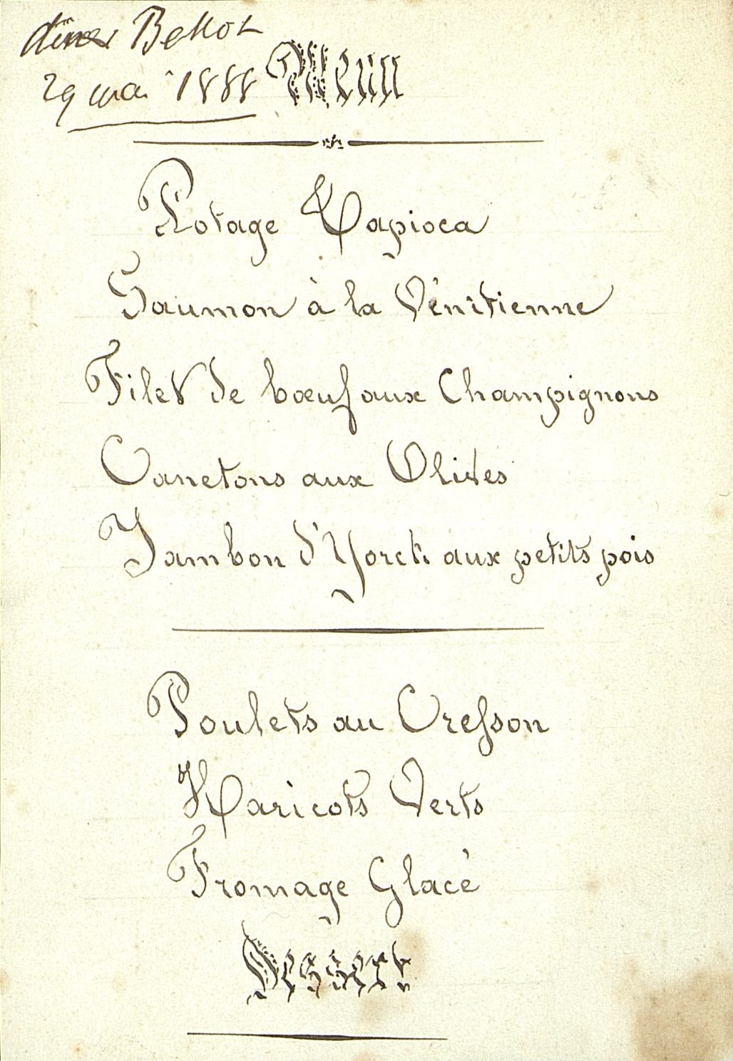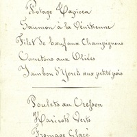 Plats servis : Potage Tapioca. Saumon à la Vénitienne. Filet de bœuf aux Champignons. Canetons aux Olives. Jambon d' York aux petits pois. Poulets au Cresson. Haricots Verts. Fromage Glacé. Dessert.