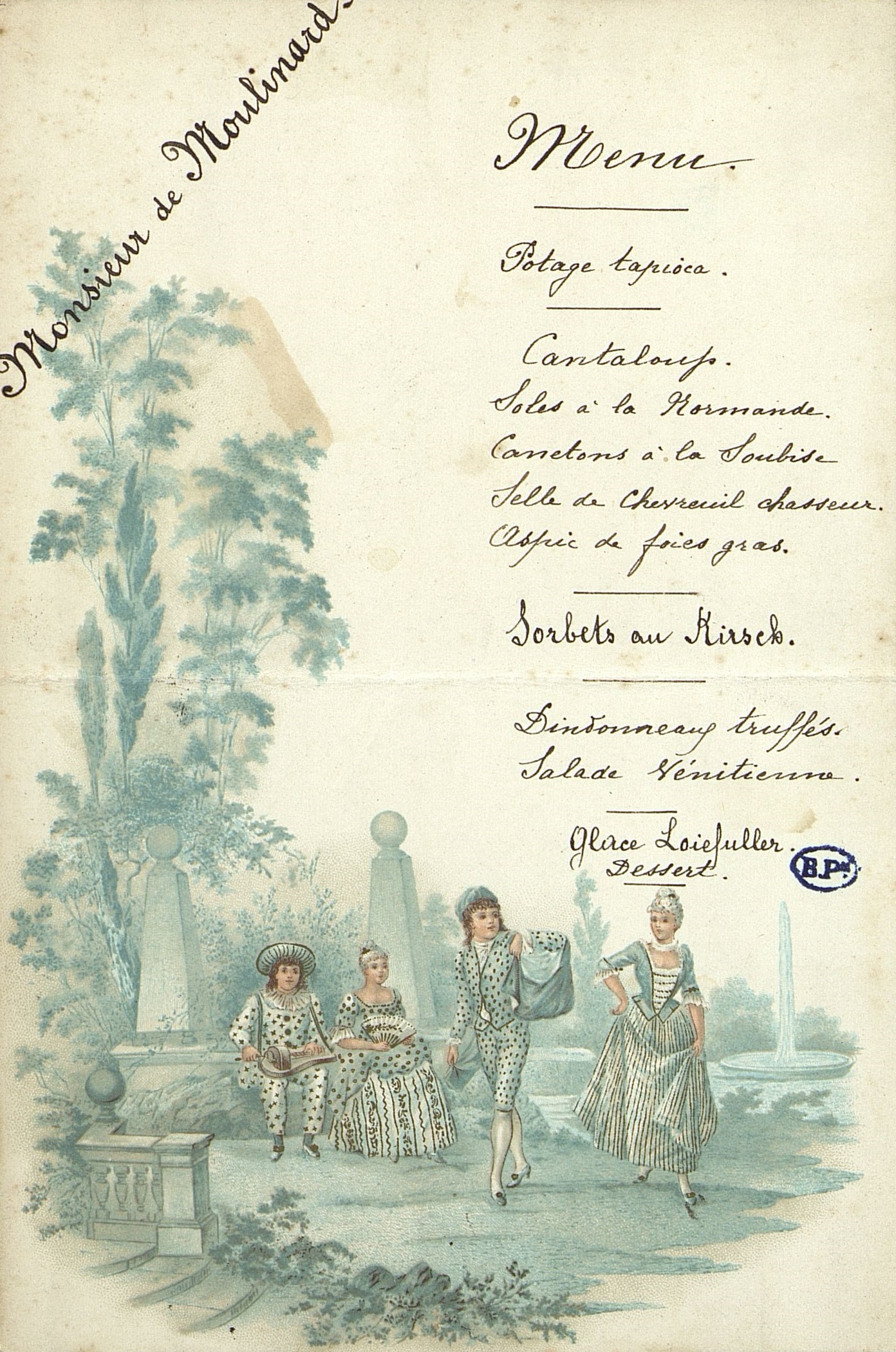 Plats servis : Potage tapioca. Cantaloup. Soles à la normande. Canetons à la Soubise. Selle de chevreuil chasseur. Aspic de foies gras. Sorbets au kirsch. Dindonneaux truffés. Salade vénitiennes . Glace Loie Fuller. Dessert .