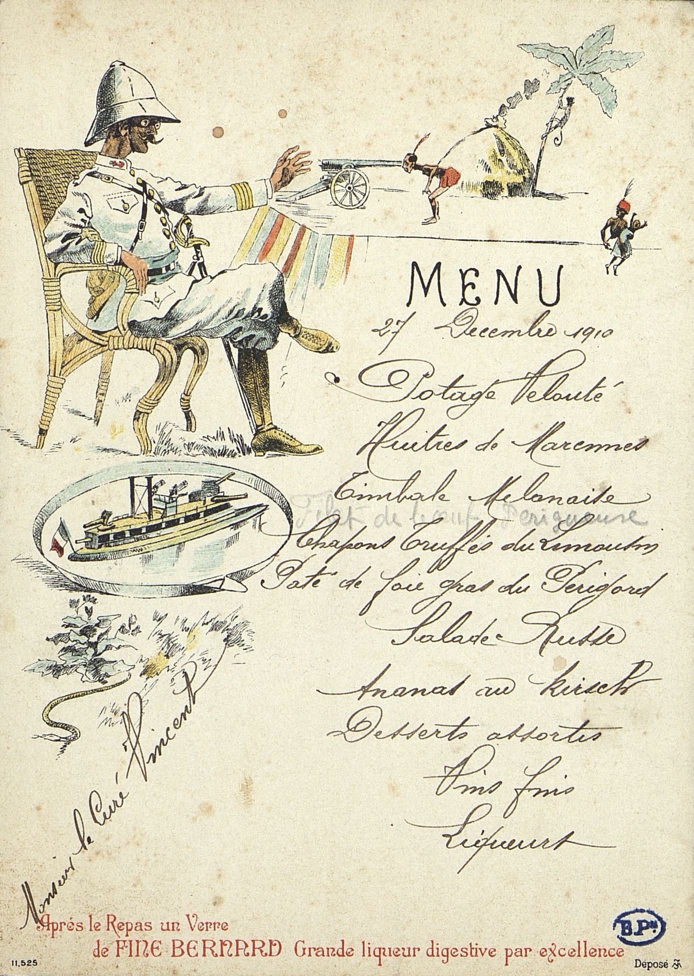 Menu du 27 décembre 1910. Dédicace à Monsieur le curé Vincent. Publicité commerciale pour la Fine Bernard. N° 11 525.