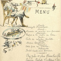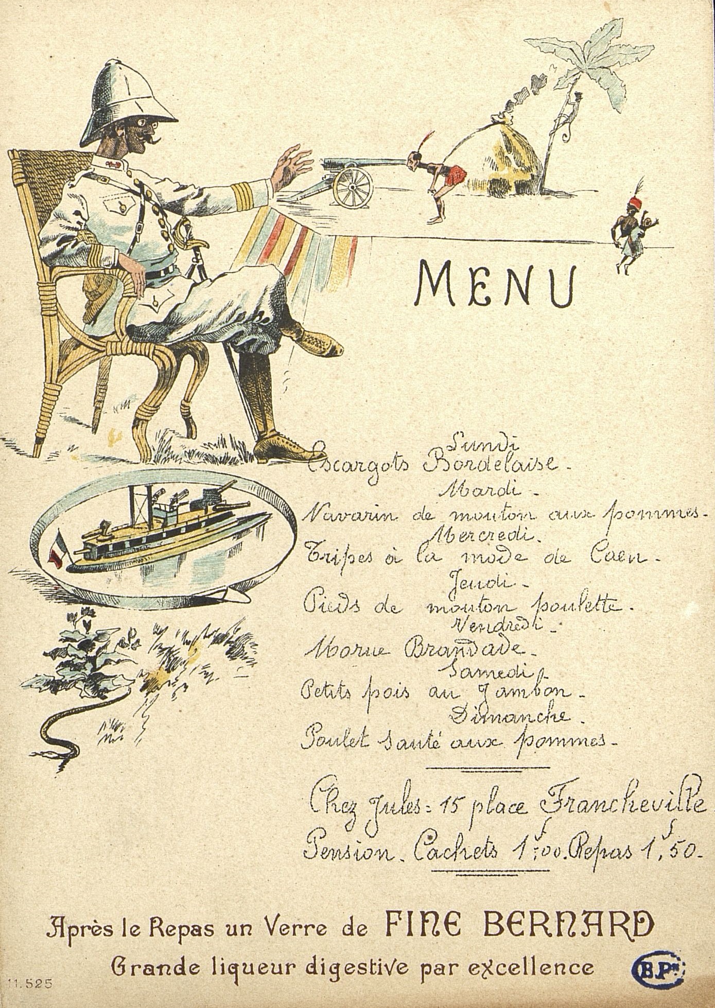 Plats servis : Menu : Lundi : Escargots Bordelaise. Mardi : Navarin de mouton aux pommes. Mercredi : Tripes à la mode de Caen. Jeudi : Pieds de mouton poulette. Vendredi : Morue brandade. Samedi Petits pois au jambon. Dimanche : Poulet sauté aux pommes.