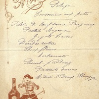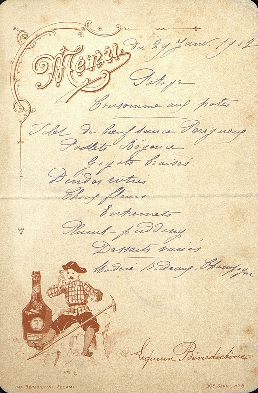 Plats servis : Potage. Consommé aux pâtes. Filet de Bœuf sauce Périgueux. Poulets Régence. Gigots braisés. Dindes rôtis. Choux fleurs. Entremets. Plum pudding. Desserts variés.
