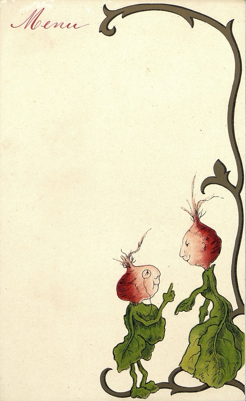 - Menu vierge humoristique avec un couple croqué en betteraves rouges.