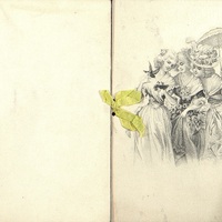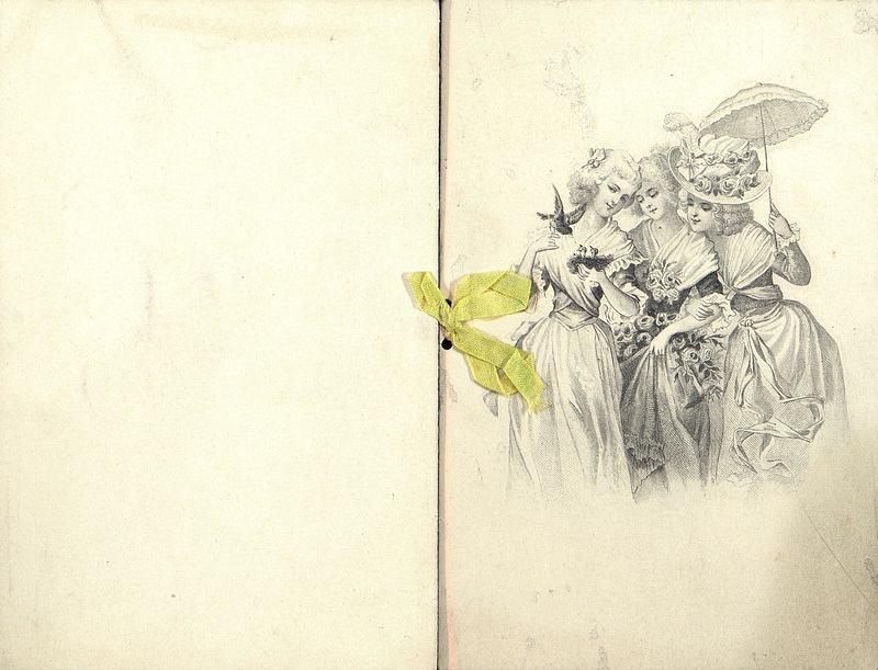 Menu pliant vierge avec un ruban tissu jaune. Trois jeuens femmes en habits de style Pompadour.