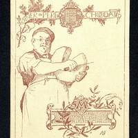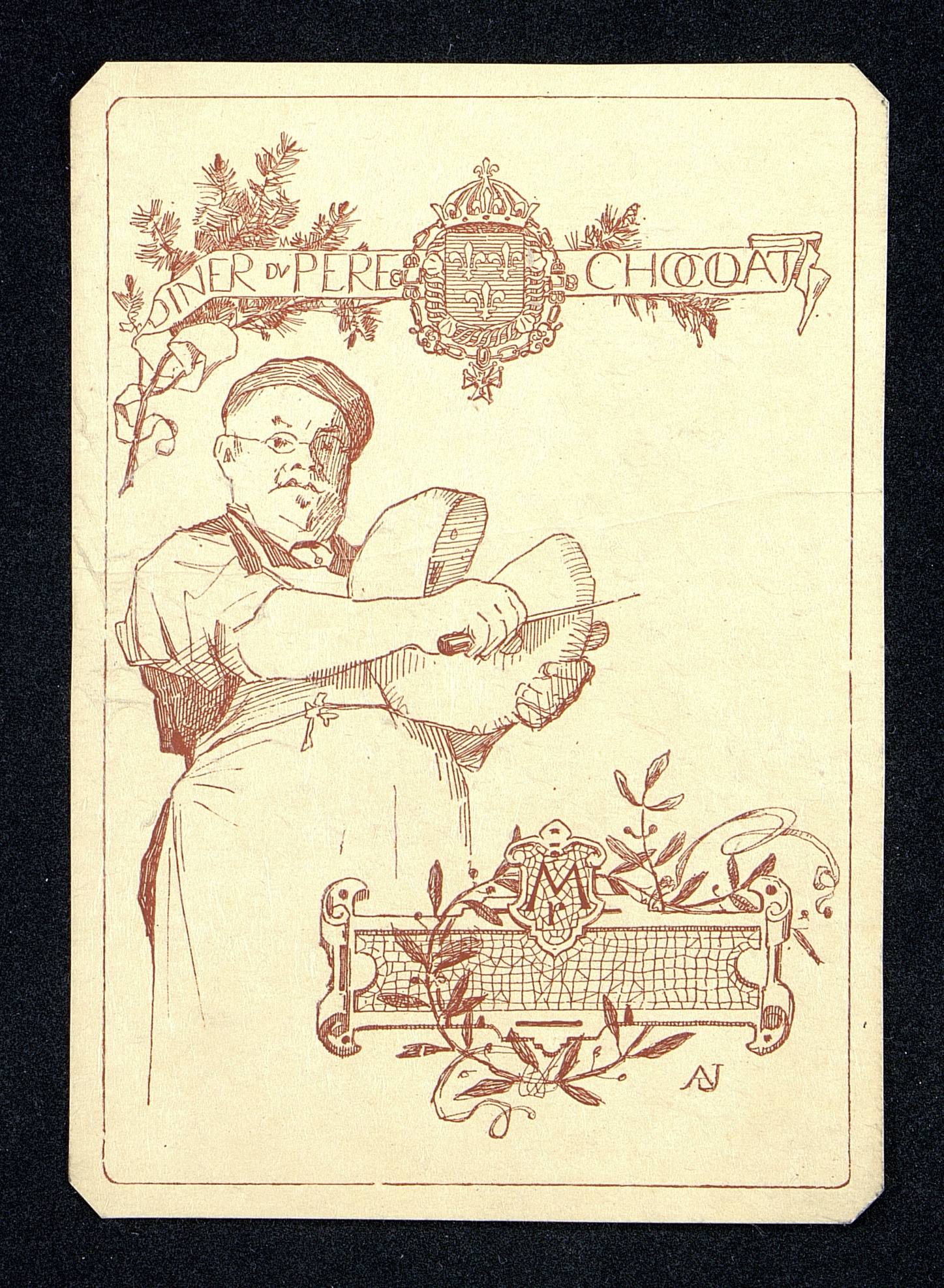 - Publicité pour le dîner du Père Chocolat sur un menu vierge. Au dos des mentions manuscrites peu lisibles, et peut-être sans rapport avec ce document. "Chemin St Anne 18/892 Madme Blanc..."