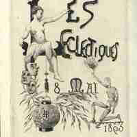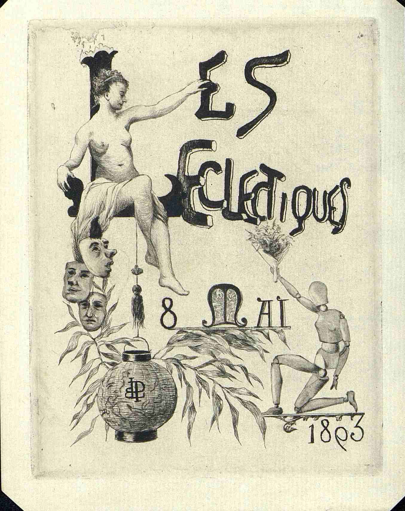 Publicité pour un Banquet des Eclectiques en date du 8 mai 1893. Trois masques e théâtre, une la,terne japonaise, une branche de bambou, un mannequin de dessin, un nue féminin voilé.