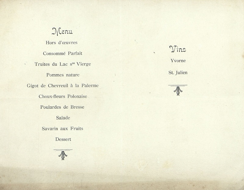 Plats servis : Hors d’œuvres. Consommé Parfait. Truites du Lac Sauce-Vierge. Pommes nature. Gigot de Chevreuil à la Palerme. Choux-fleurs Polonaise. Poulardes de Bresse. Salade. Savarin aux fruits. Dessert.
