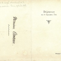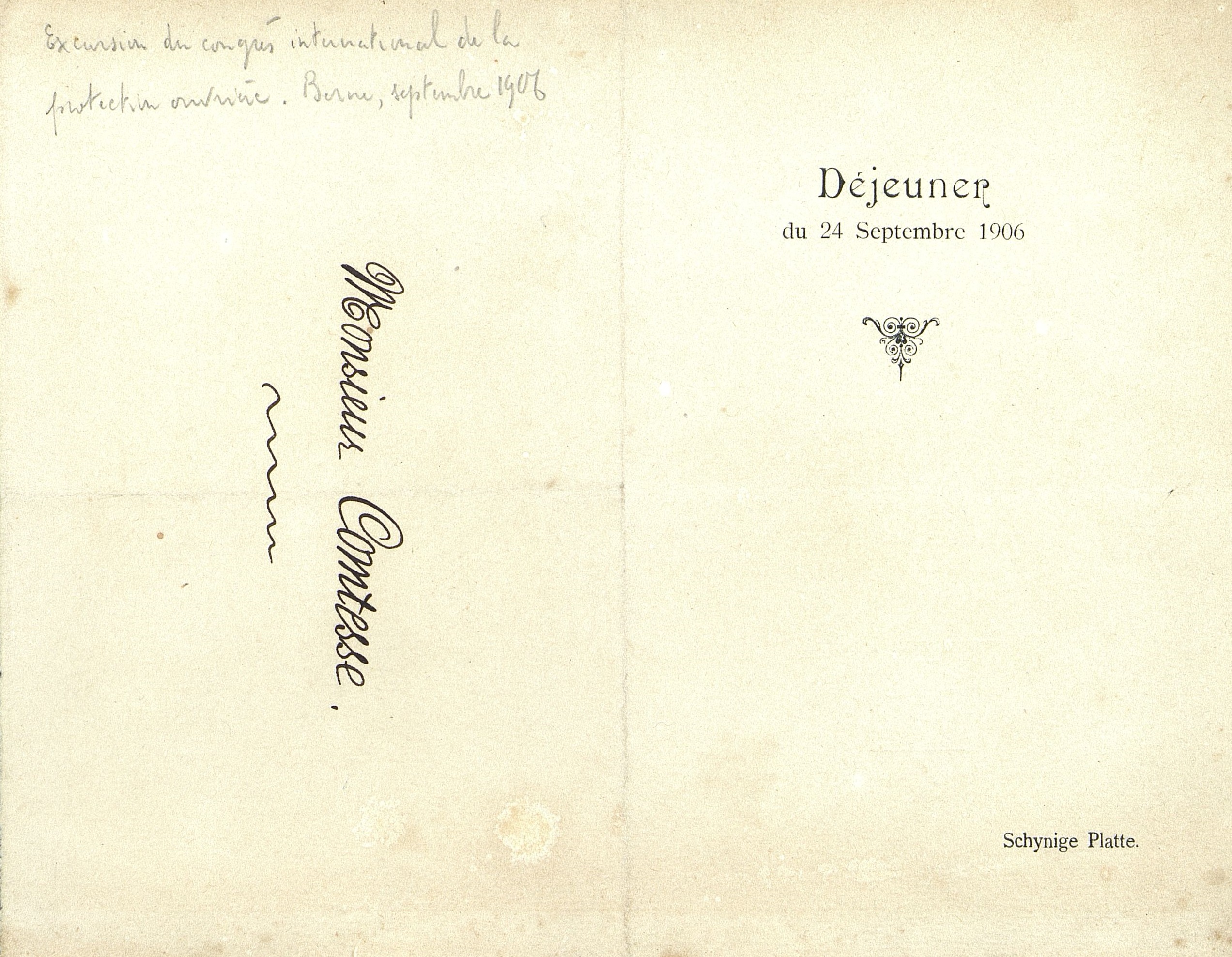 Menu pliant consacrant le Congrès international de la protection ouvrière à Berne. Mentions manuscrites aux verso : Excursion du Congrès international de la protection ouvrière. septembre 1906.