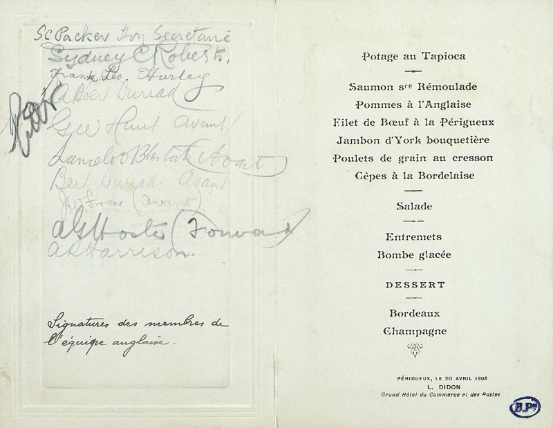 Notes manuscrites au verso : Équipe anglaise : Sc Packer Iton secrétaire. Sydney C. Roberts. Franck Leo Harley. Albert Durrad. Lee Hunt , avant. Lancelot Black ? , Avant. Bert Durrad, Avant. JWfreer (Avant). Alsttoste, Howard. AR Harrison. OBar.