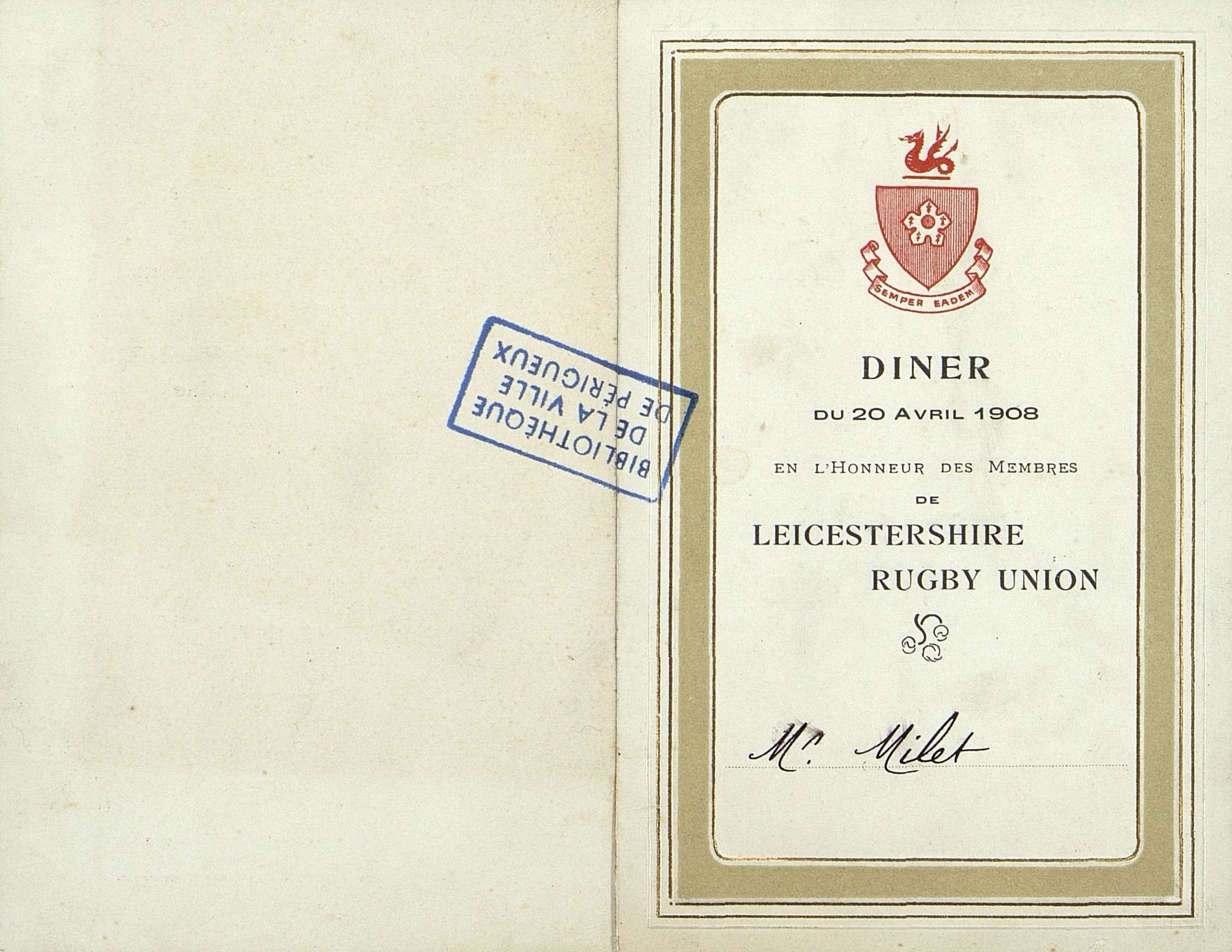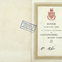 Dîner en l'honneur du Leicestershire rugby union. Nombreuses mentions autographes. Armoiries : Écu "De gueules à la quintefeuille d’hermine". Devise : "Semper eadem" = "Toujours le même" rehaussé d'un dragon volant de gueule.