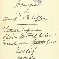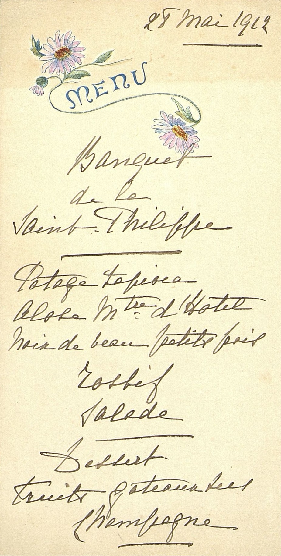 Banquet de la Saint-Philippe à décor de fleurs, en date du 28 mai 1912. Illustrations : trois marguerites en lac.