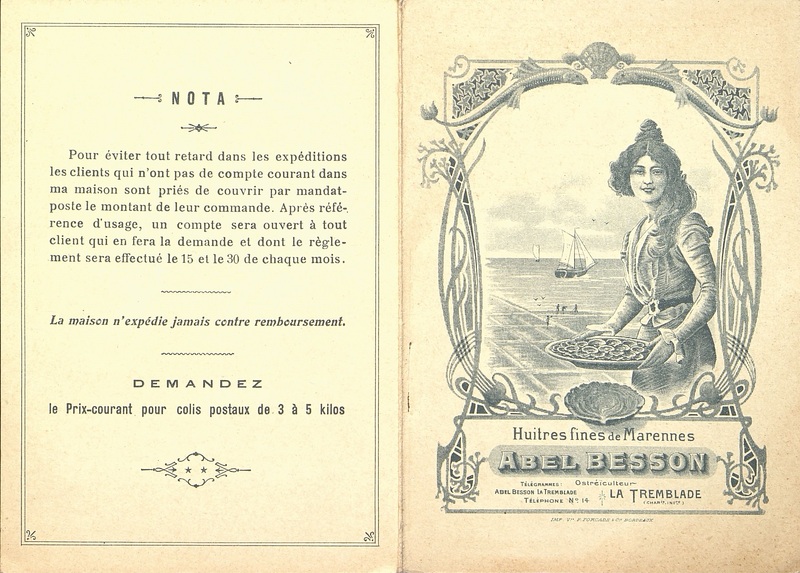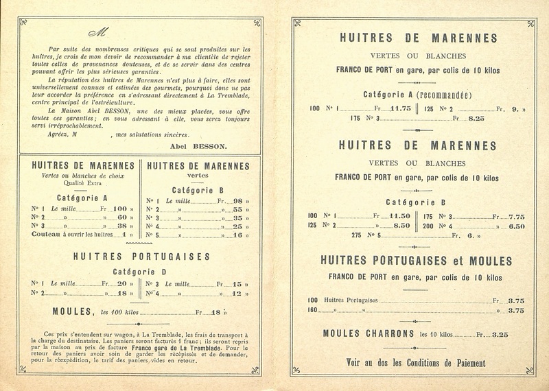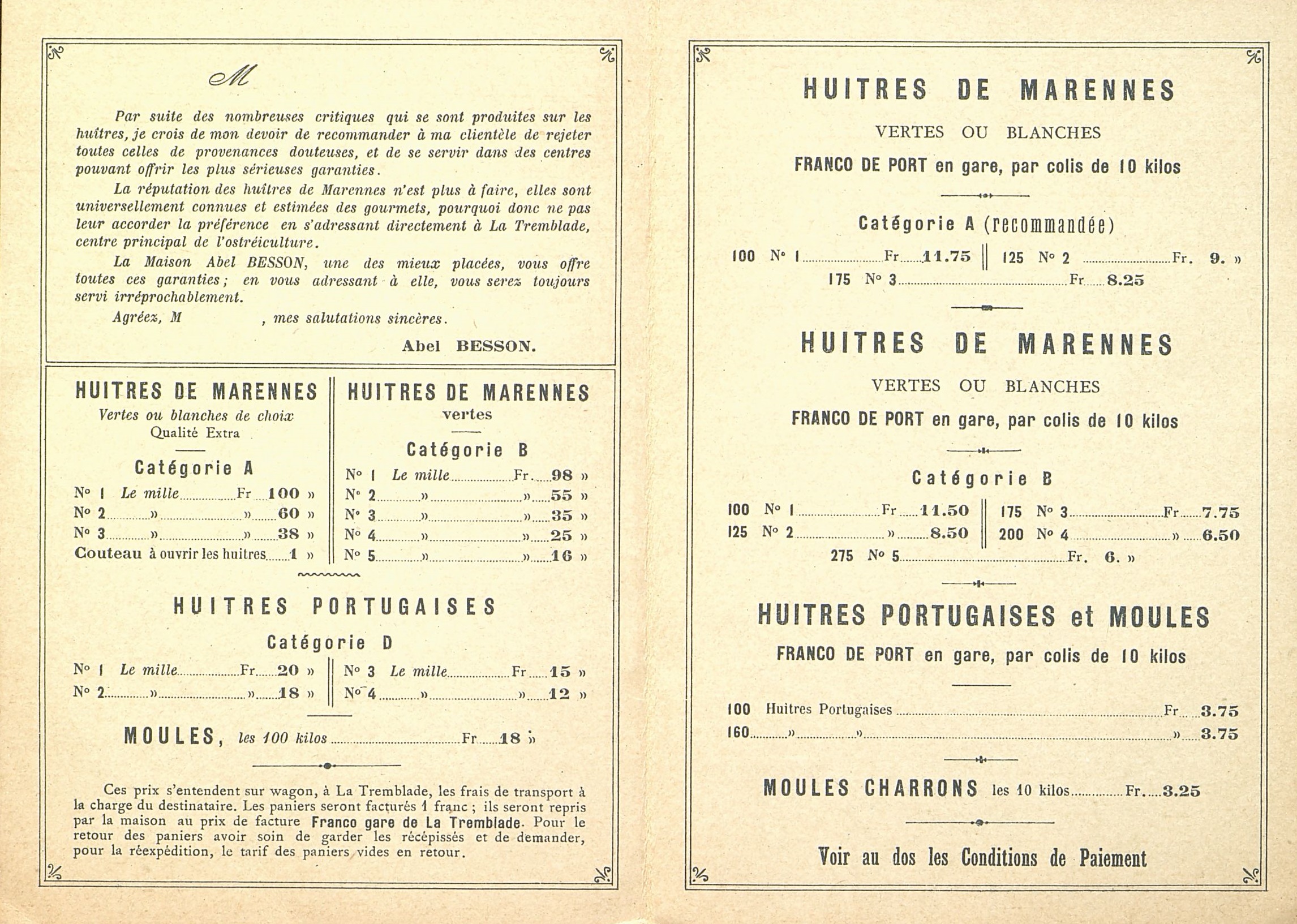 - Dépliant publicitaire des huîtres Abel Besson avec tarifs et conditions de vente.