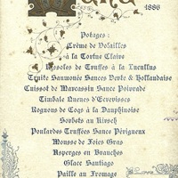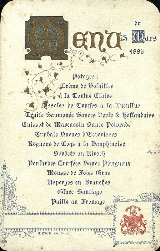 Plats servis : Crème de Volailles à la Tortue Claire. Rissoles de Truffes à la Lucullus. Truite Saumonée Sauve Verte de Hollande. Cuissot de Marcassin sauce Poivrade. Timbale Nunes d’Écrevisses. Rognons de Coqs à la Dauphinoise. Sorbets au Kirsch. Poulardes Truffées sauce Périgueux. Mousse de Foies Gras. Asperges en Branches. Glace Santiago. Paille au Fromage.