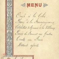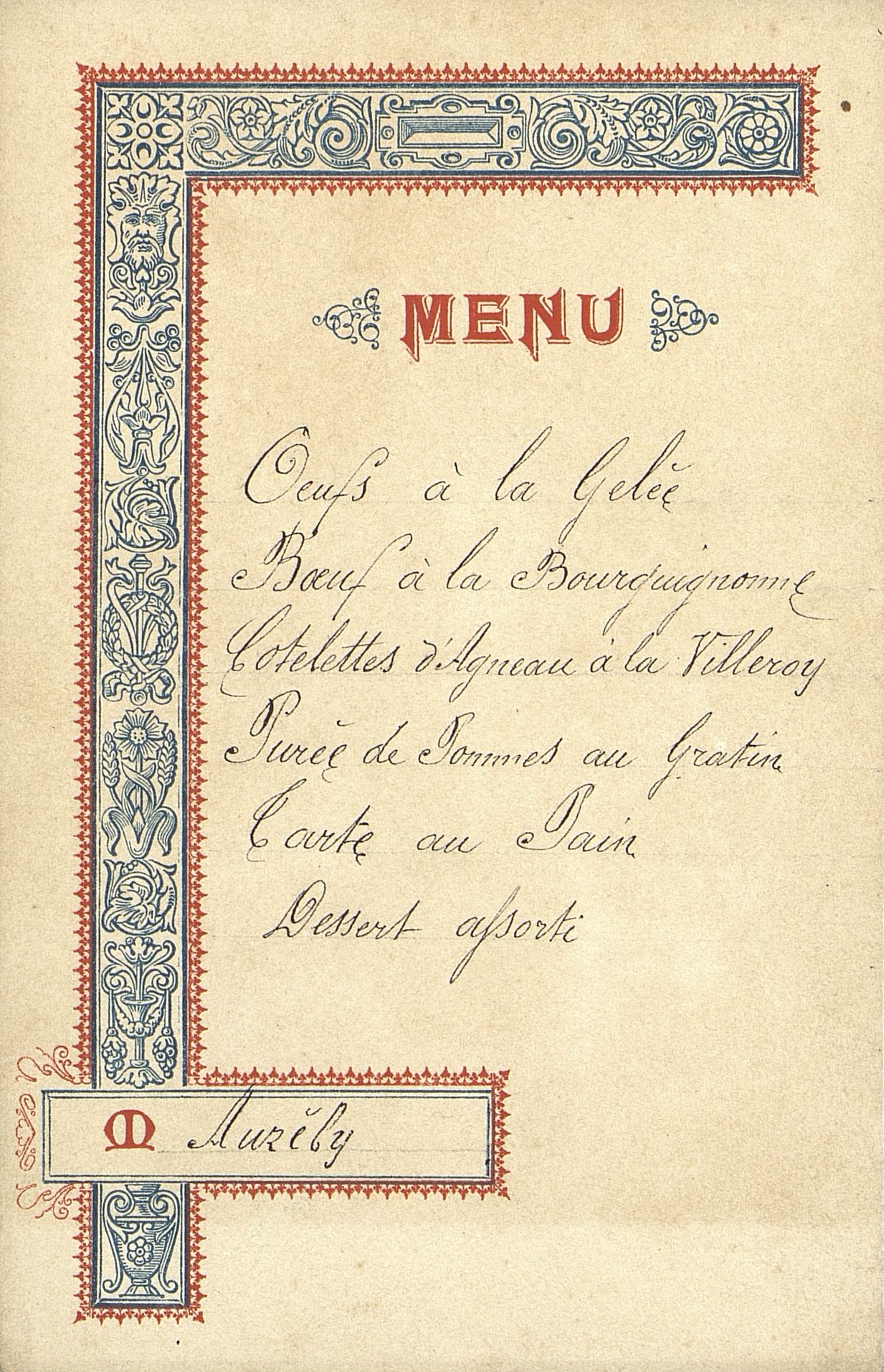 Plats servis : Oeuf à la Gelée. Bœuf à la Bourguignonne. Côtelettes d'Agneau à la Villeroy. Purée de Pommes au Gratin. Tarte au pain. Dessert assorti.