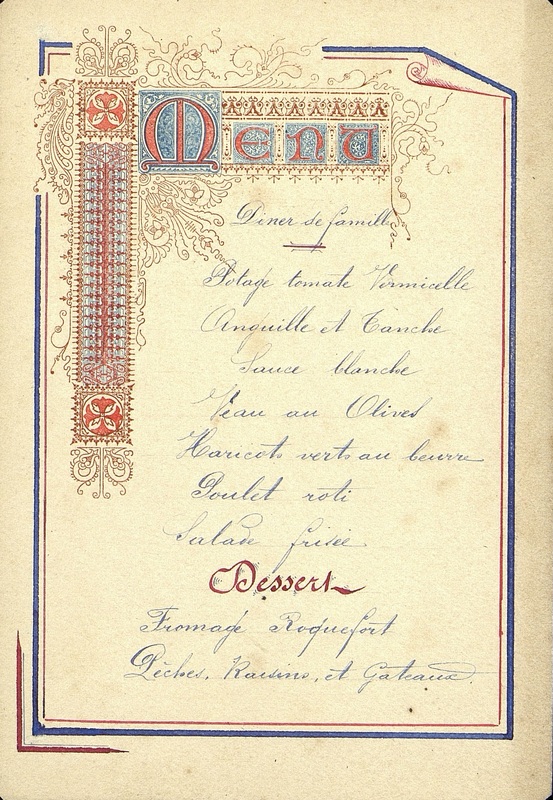 - Plats servis : Potage tomate vermicelle. Anguille et Tanche sauce blanche. Veau aux Olives. Haricots vers au Beurre. Poulet rôti. Salade frisée. Dessert. Fromage Roquefort. Pèches. Raisins et Gâteaux.