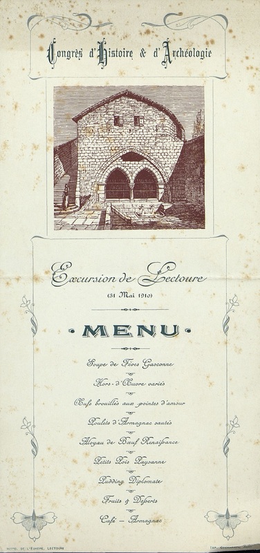 Plats servis : Soupe de Fèves Gasconne. Hors d’œuvre variés. Oeufs brouillés aux pointes d'amour. Poulets d'Armagnac sautés. Noyau de Bœuf Renaissance. Petits Pois Paysanne. Pudding Diplomate. Fruits et Desserts .