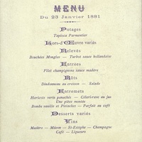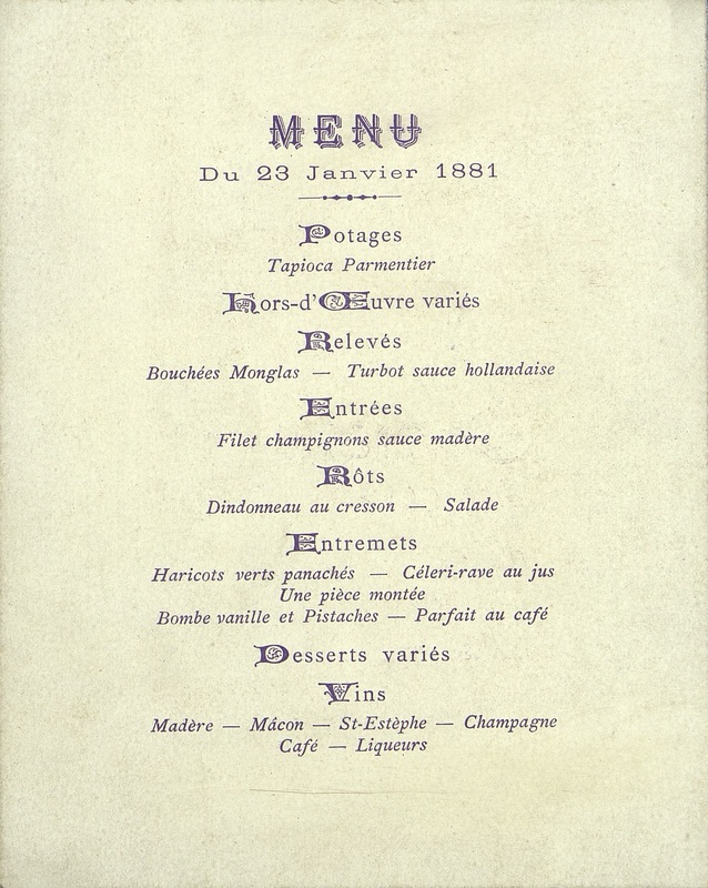 Plats servis : Tapioca Parmentier. Hors d’œuvre variés. Bouchées Monglas. Turbot sauce hollandaise. Filet champignons sauce madère. Dindonneau au cresson. Salade. Haricots verts panachés. Céleri-rave au jus. Une pièce montée. Bombe vanille et Pistaches. Parfait au café. Desserts variés.