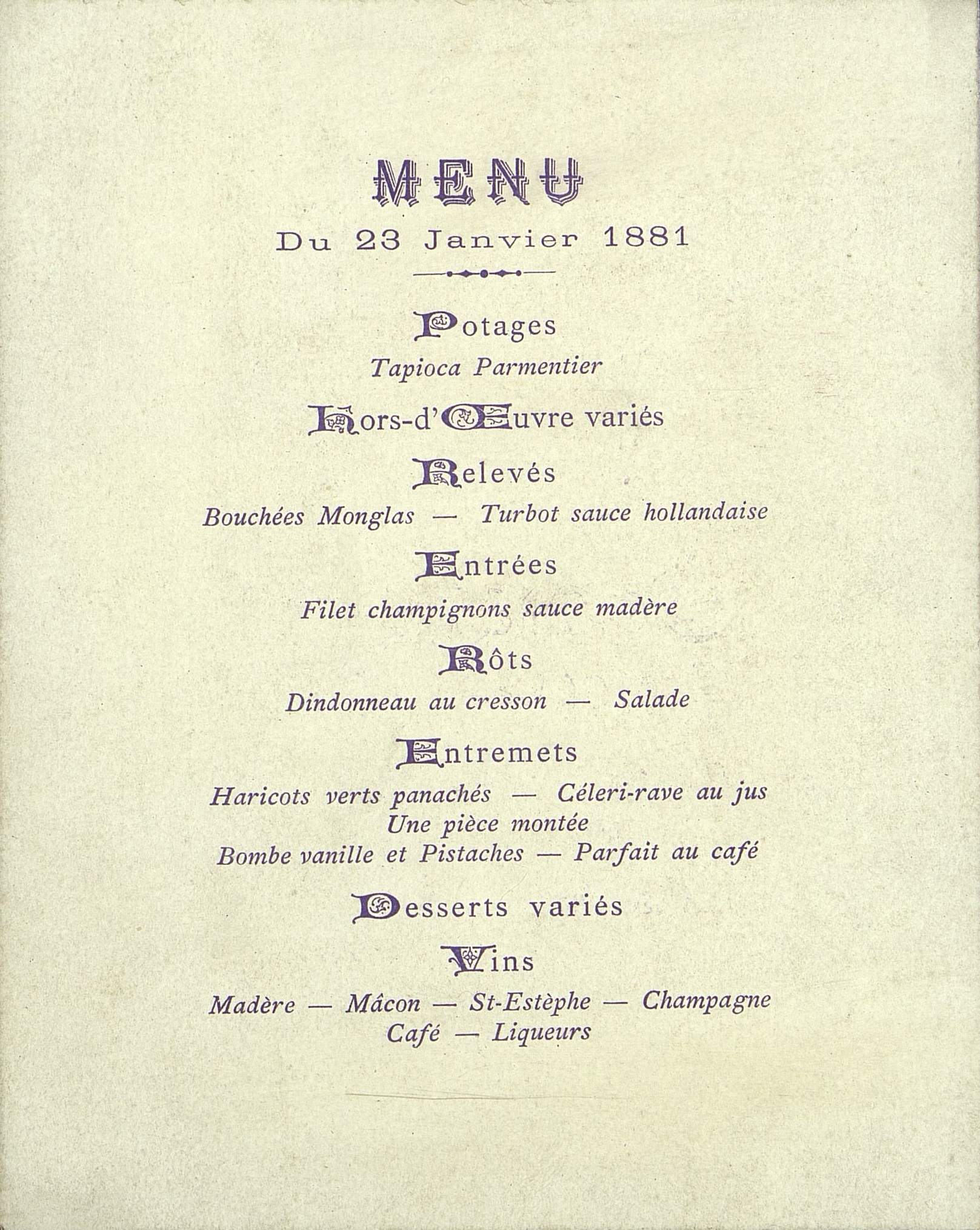 Boissons : Vins : Madère. Mâcon. St-Estèphe. Champagne. Café et Liqueurs.