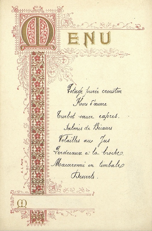 Plats servis : Potage purée crouston. Hors d’œuvre. Turbot sauce capres. Salmis de Bécasses. Volailles aux Jus. Perdreaux à la broche. Macaronis en timbales. desserts.
