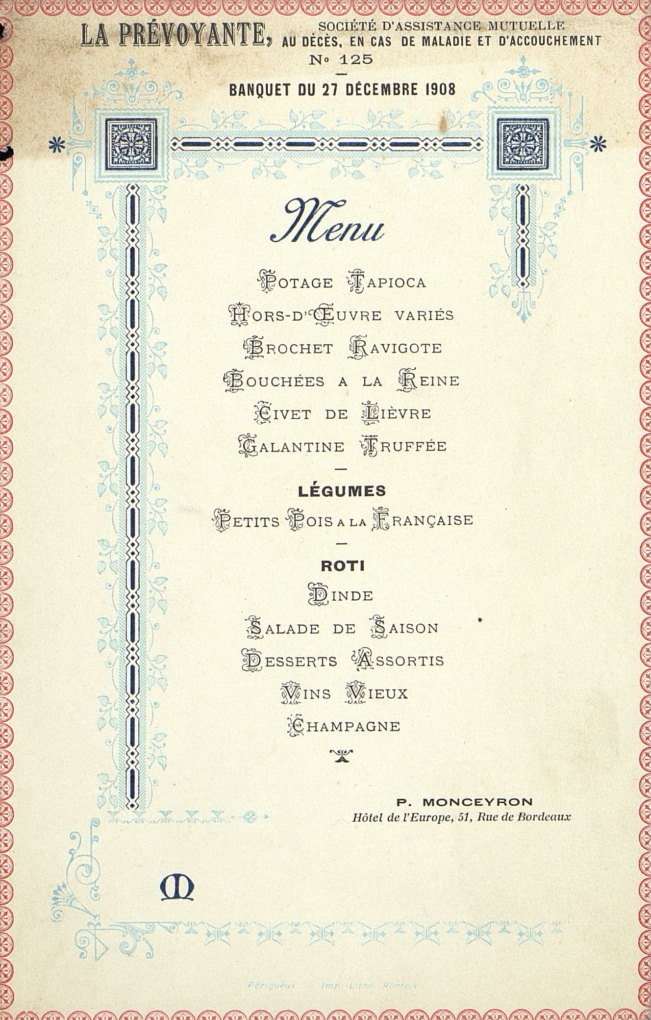 Plats servis : Potage Tapioca Hors-d’œuvre variés. Brochet Ravigote. Bouchées à la Reine.Civet de Lièvre. Galantine Truffée. Légumes : Petits Pois à la Française Rôti : Dinde. Salade de Saison. Desserts Assortis .