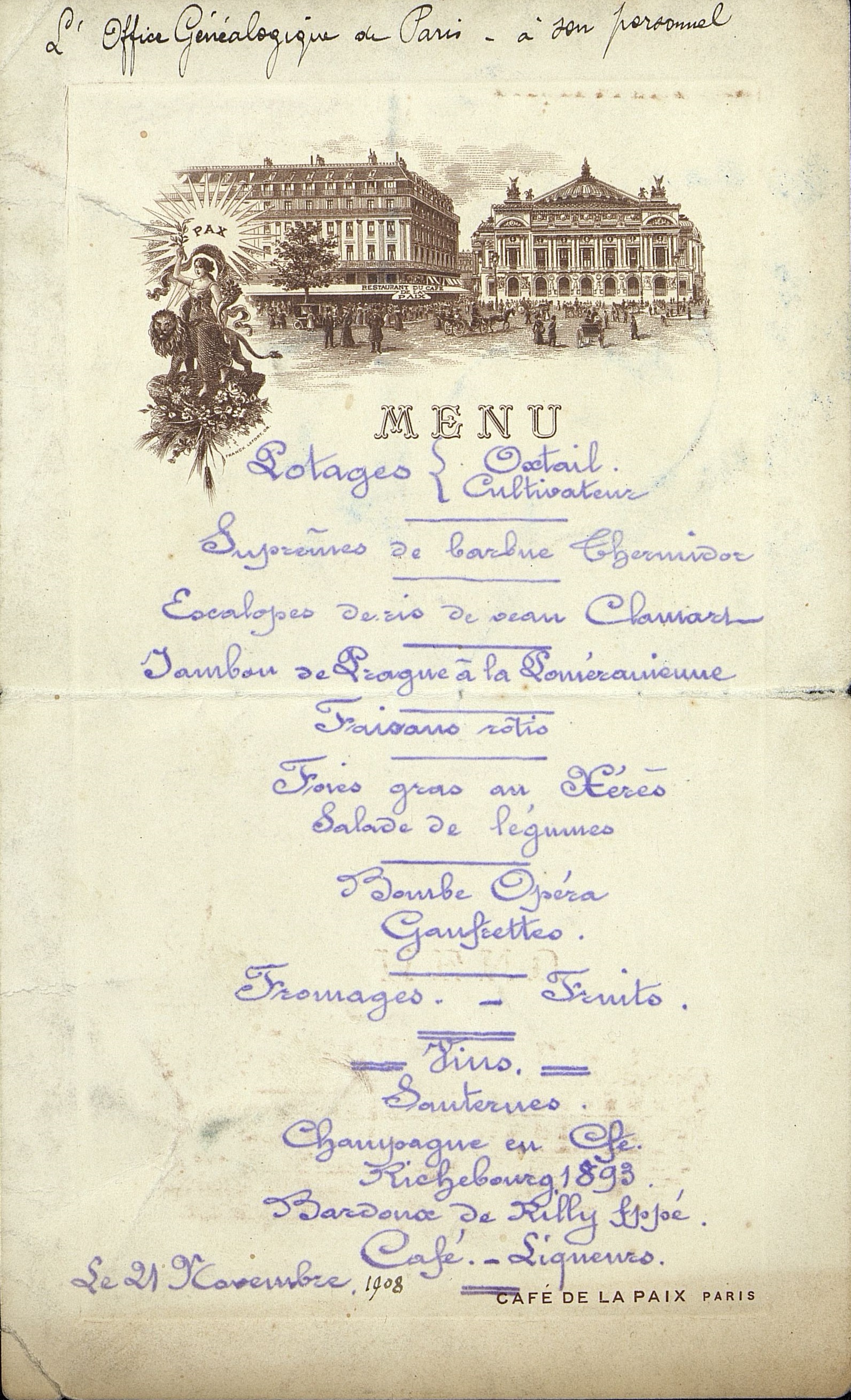 Menu offert par l'Office Généalogique de Paris à son personnel au Café de la Paix à Paris. Illustration : "Pax" allégorie de Franck Lefort