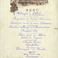 Plats servis : Potages : Oxtail [soupe de queue de bœuf] et Cultivateur. Suprêmes de barbue à la Thermidor. Escalopes de ris de veau Clamart [ aux petits pois]. Jambon de Prague à la Poméranienne. Faisans rôtis. Foies gras au Xérès. Salade de légumes. Bombe Opéra. Gaufrettes. Fromages-Fruits