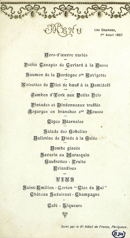 Menu aux Granges, servi par le Grand Hôtel de France du 1er août 1907. Au dos en manuscrit : M. Chevé.