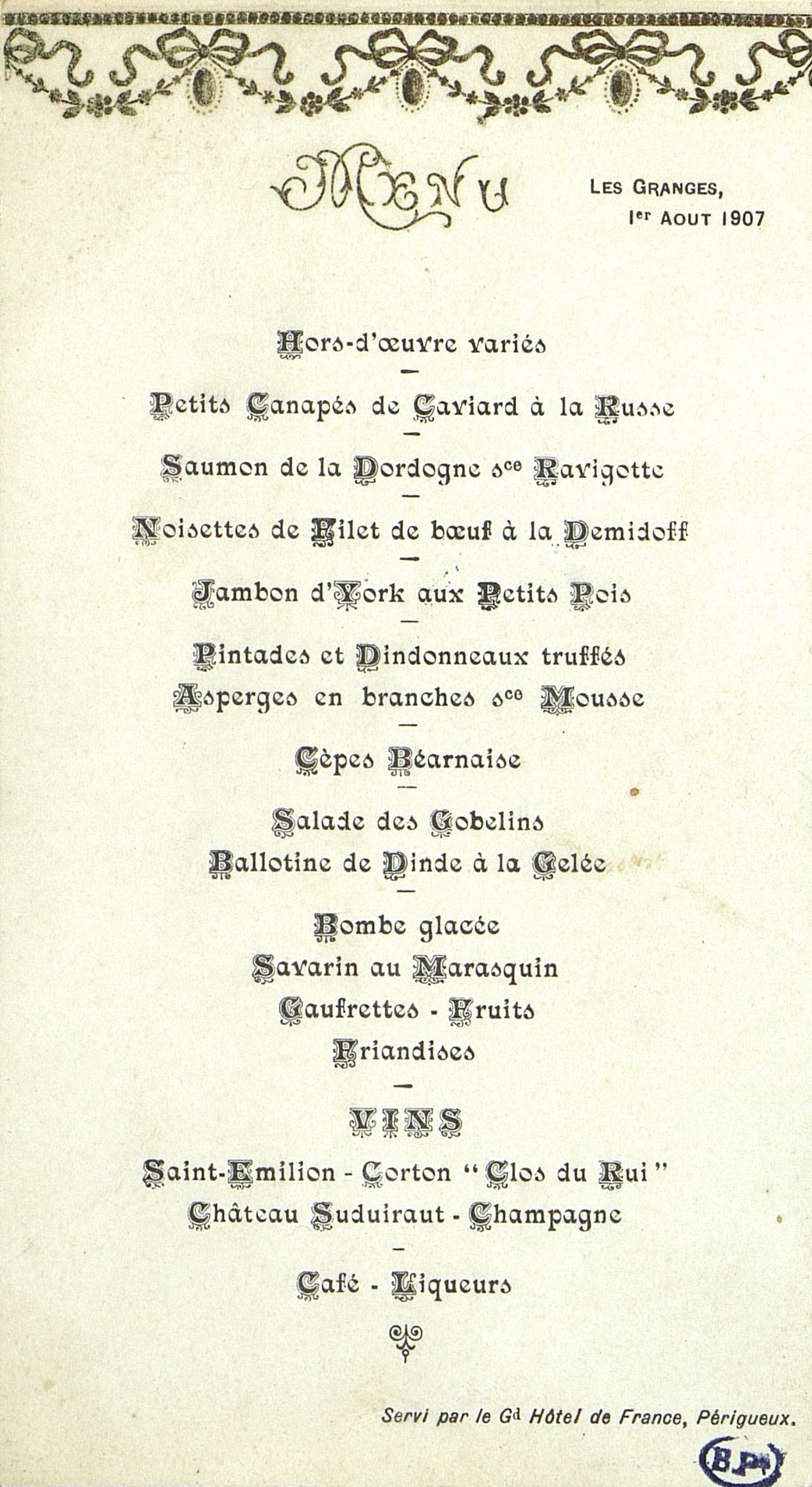 Plats servis : Hors d’œuvre variés. Petits Canapés de Caviard à la Russe. Saumon de la Dordogne Sauce Ravigote. Noisettes de Filet de bœuf à la Demidoff. Jambon d'York aux Petits Pois. Pintades et Dindonneaux truffés. Asperges en branches sauce Mousse. Cèpes Béarnaise. Salade des Gobelins. Ballotine de Dinde à la Gelée. Bombe glacée. Savarin au Marasquin. Gaufrettes, Fruits. Friandises.