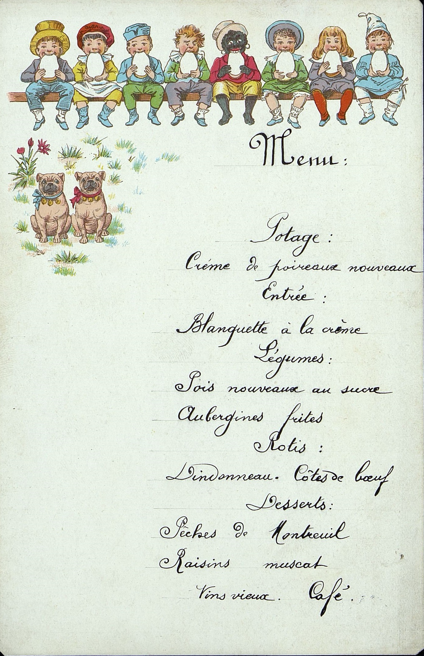 Menu manuscrit illustré de huit bambins alignés croquants dans une tartine de pain blanc accompagnés de deux dogues à collier à grelots.