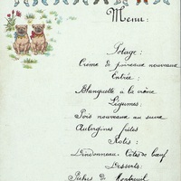 Entrée : Blanquette à la crème. Légumes : Pois nouveaux au sucre. Aubergines frites. Rôtis : Dindonneau. Côtes de bœuf. Desserts : Pêches de Montreuil. Raisins muscat