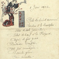 Menu manuscrit daté du 1er juin 1902 avec un décor japonnais . Au dos écriture manuscrite : Monsieur Eyguière (?)