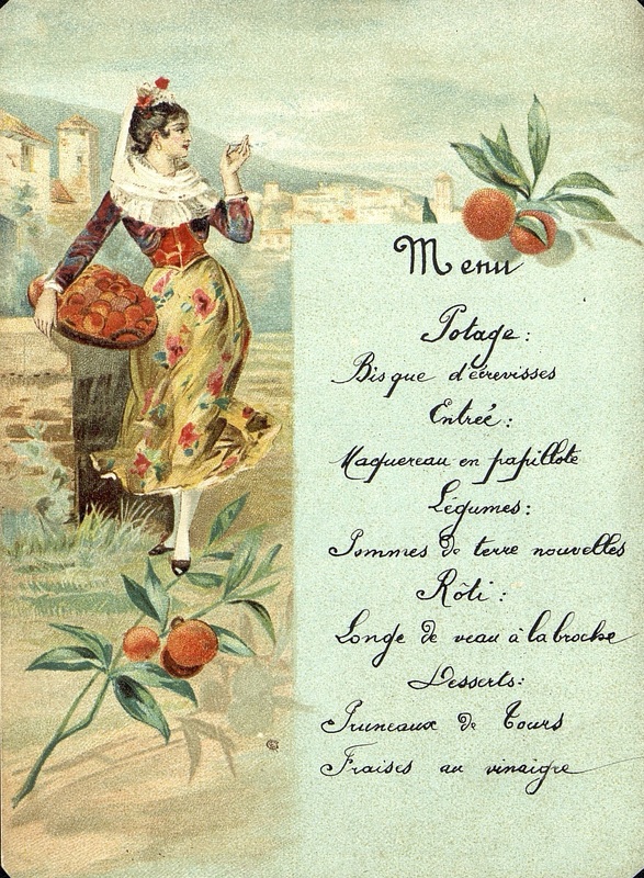 Plats servis : Potage : Bisque d'écrevisses. Entrée : Maquereau en papillote. Légumes : Pommes de terre nouvelles. Rôti : Longe de veau à la broche. Desserts : Pruneaux de Tours. Fraises au vinaigre.