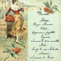 Menu manuscrit avec une jeune fille portant un panier de pêches ou autre fruit. G.E. illustrateur