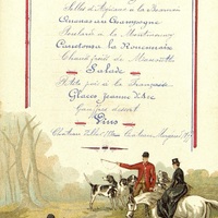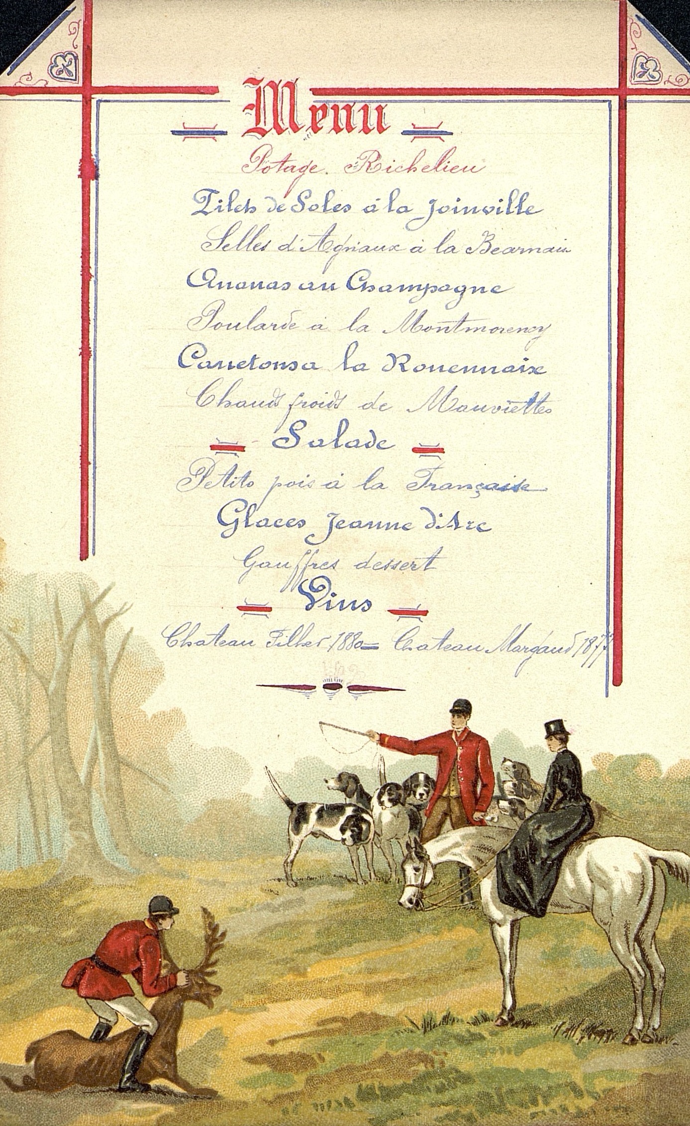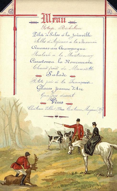 Plats servis : Potage Richelieu. Filets de Soles à la Joinville. Selles d'Agneaux à la Béarnaise. Ananas au Champagne. Poularde à la Montmorency. Canetons à la Rouennaise. Chaud-froids de Mauviettes. Salade. Petits pois à la Française. Glaces Jeanne d'Arc.