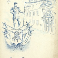 Menu vierge du banquet des Brutions du Sud-Ouest. Armes : écu "D'argent au B d'azur au foulard portant devise à la flèche d'or « S + KO : Soufre et potasse » , qu'il faut lire « souffre et potasse ! », pour rappeler que les élèves sont là pour travailler. Trois drapeaux sur pique 1848 supportent à dextre et senestre posés sur un rameau de lauriers.