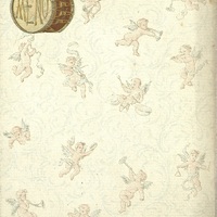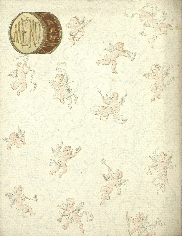 Menu vierge [non daté, rinceaux bleus clairs aux angelots musiciens et tambour cuivré].