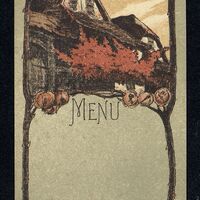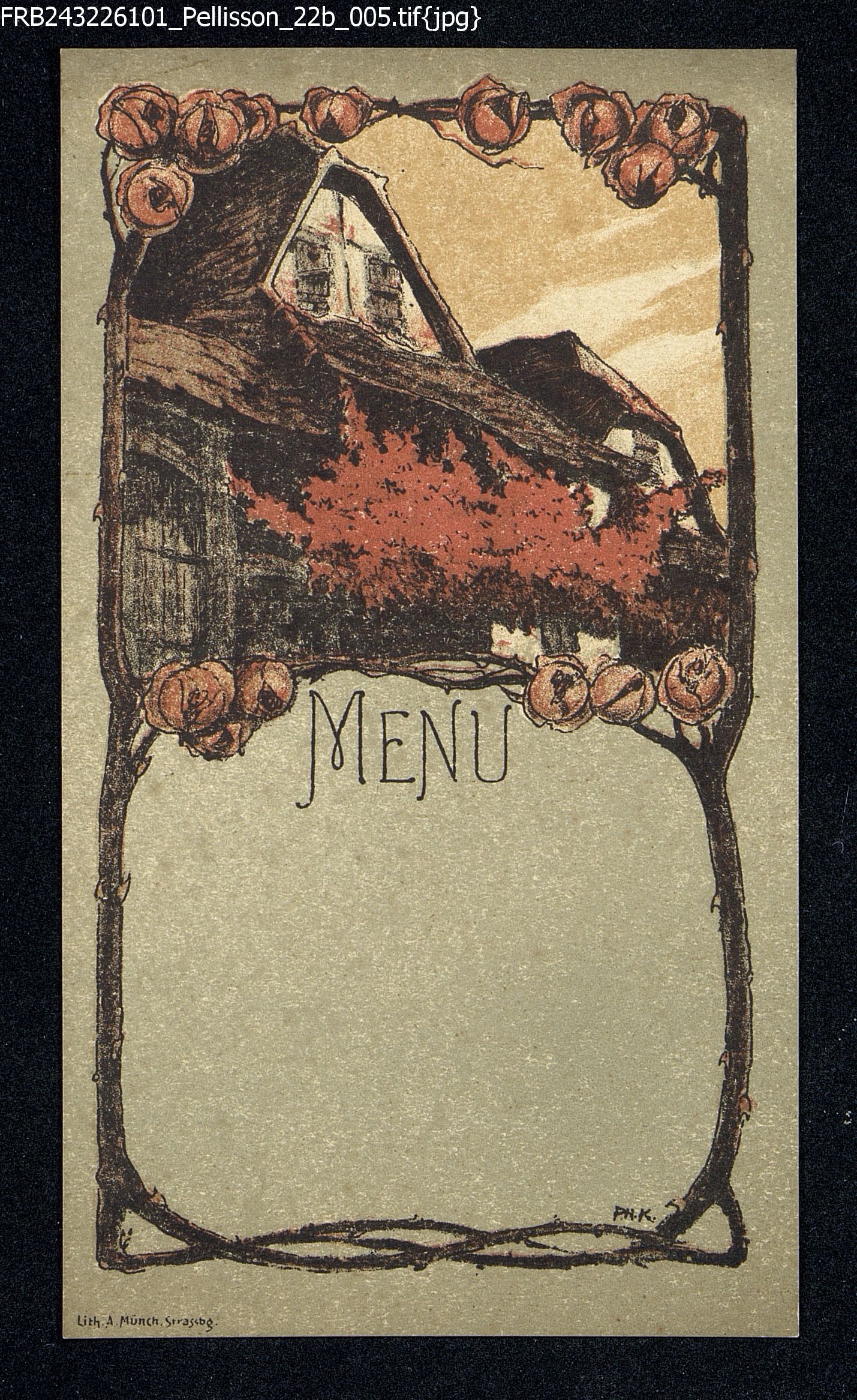 Menu vierge- Illustration : vieilles maisons alsaciennes avec un encadrement de rosiers en fleurs.