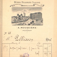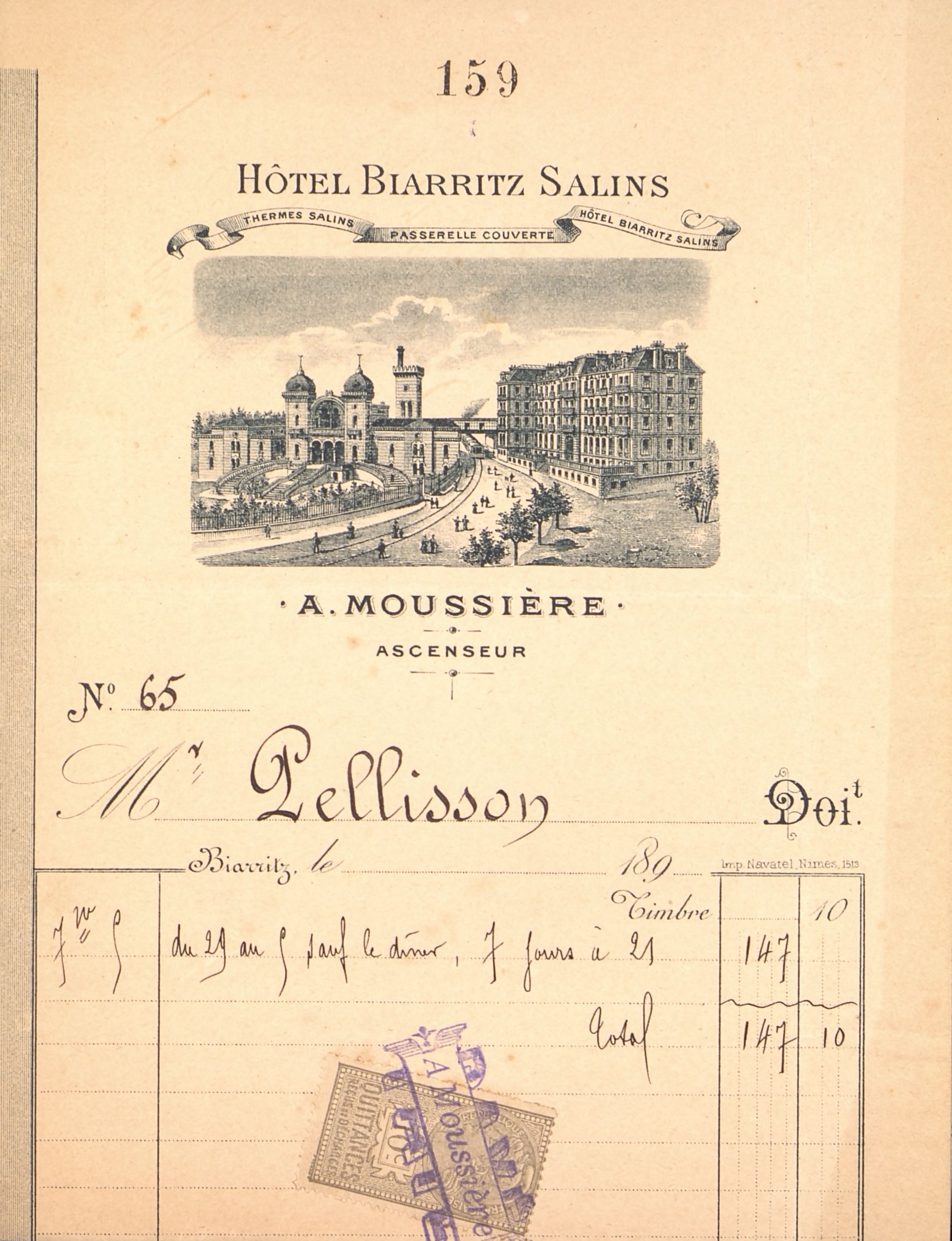 Facture nominative de l'Hôtel Biarritz Salins. Timbre et oblitération. Illustration : vignette entête.