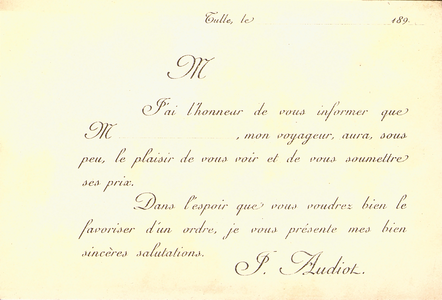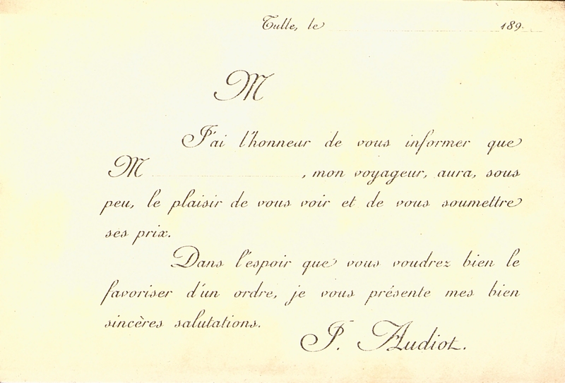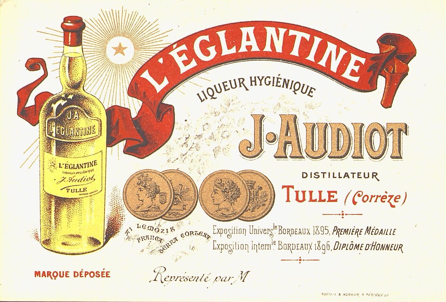 Carte de visite de représentant commercial publicitaire pour la liqueur hygiénique l’Églantine, distillée à Tulle.